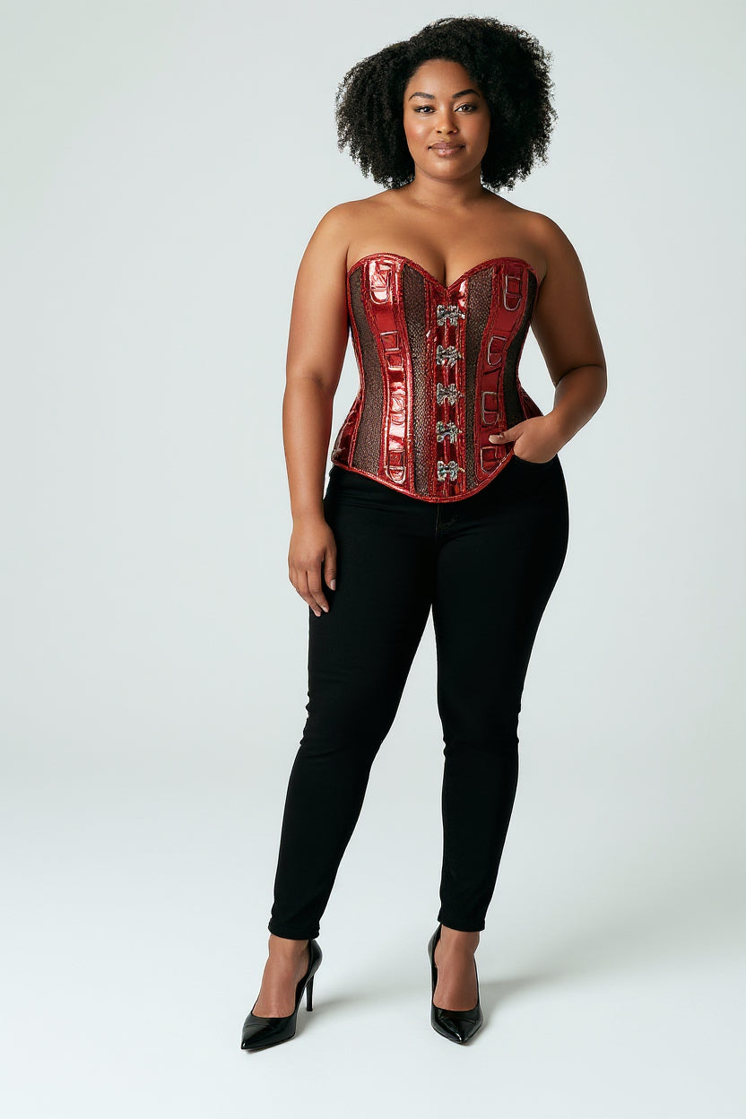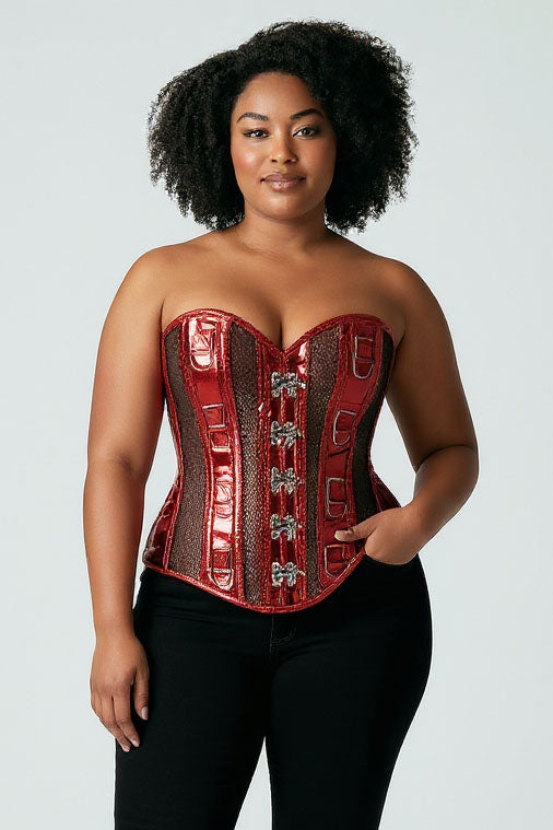 This Top Drawer Red Metallic PVC & Fishnet Steel Boned Corset from Daisy Corsets is a romantic dream come true. Crafted from premium PVC and fishnet fabric, it features a premium front metal clasp closure and 8 spiral steel bones with 4 static back bones and 4 static front bones. Nickel brass grommets with thick cording in the back provide cinching and garter loops for a perfect fit. Hand wash for best results.