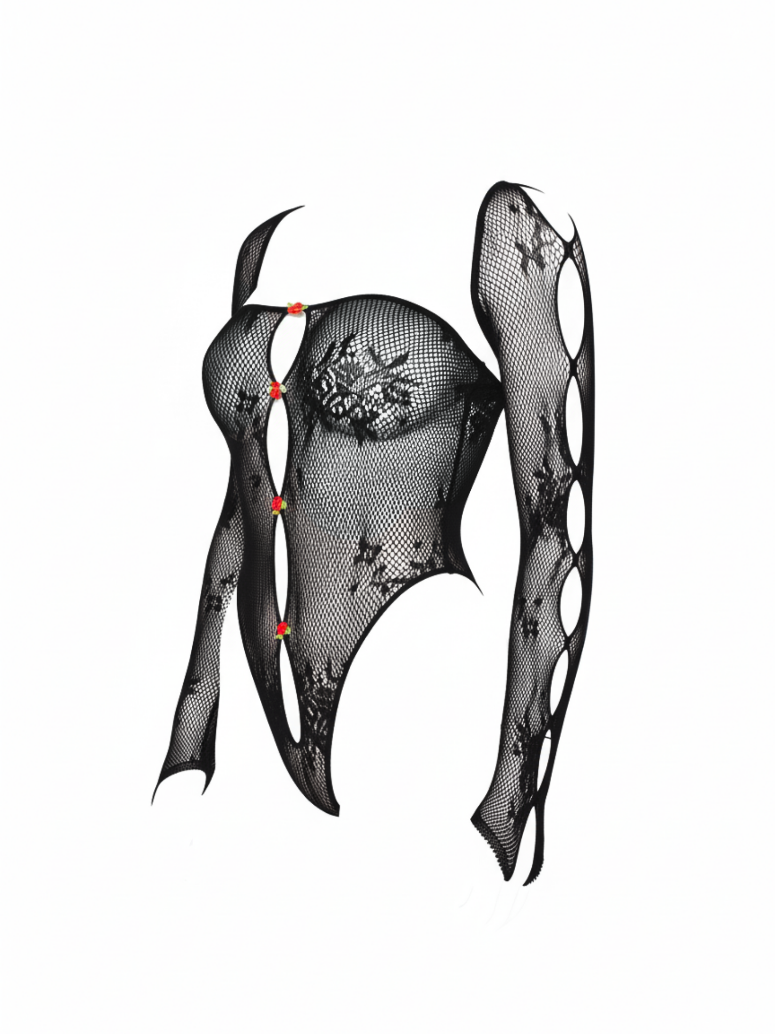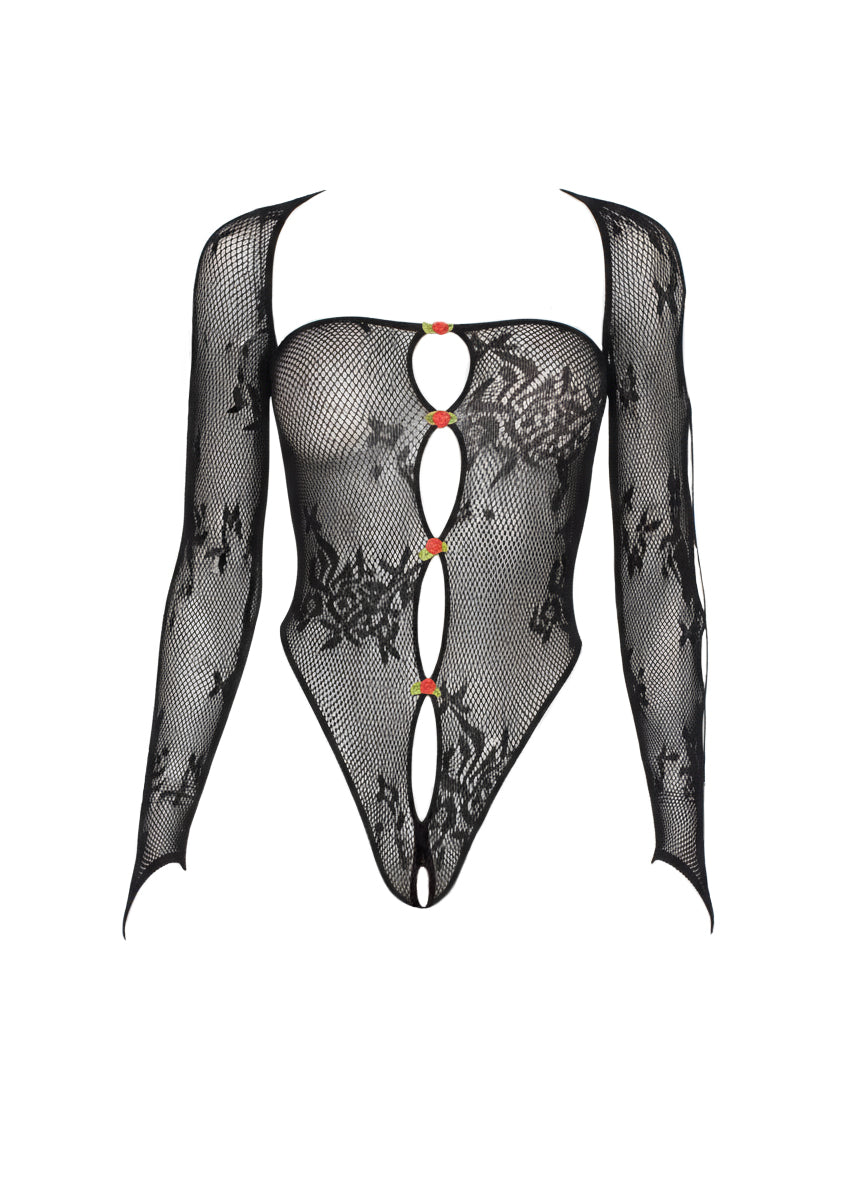 Bring a little drama to the bedroom in this sultry 2 PC lace lingerie set by Leg Avenue. The sheer keyhole bodysuit combines delicate lace with tempting fishnet, while dainty rosette accents add a romantic touch. Complete with a matching shrug, this crotchless lingerie look is equal parts sweet and scandalous—perfect for making hearts race.