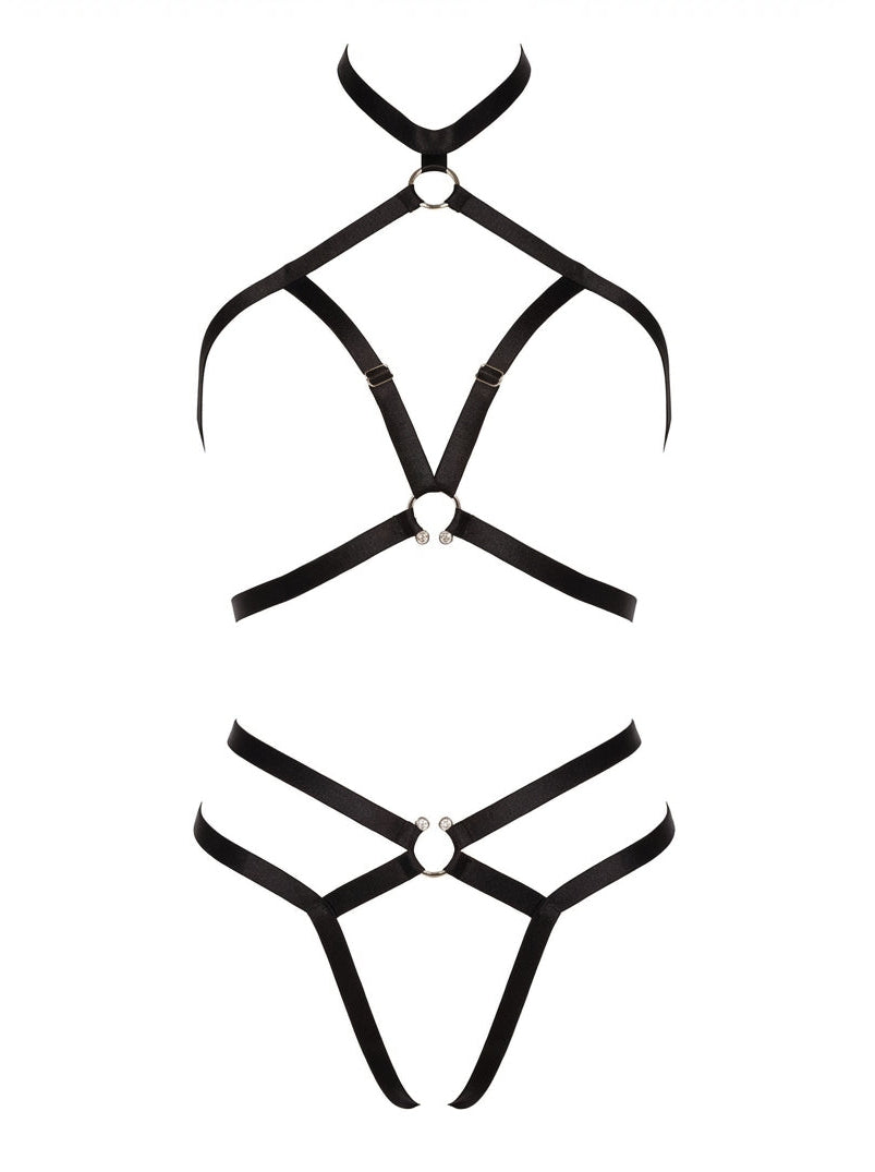 Unleash your wild side in this daring harness teddy by Leg Avenue. This sexy lingerie teddy features a satin elastic wrap-around body harness with silver bypass rings and adjustable straps. Pasties not included.