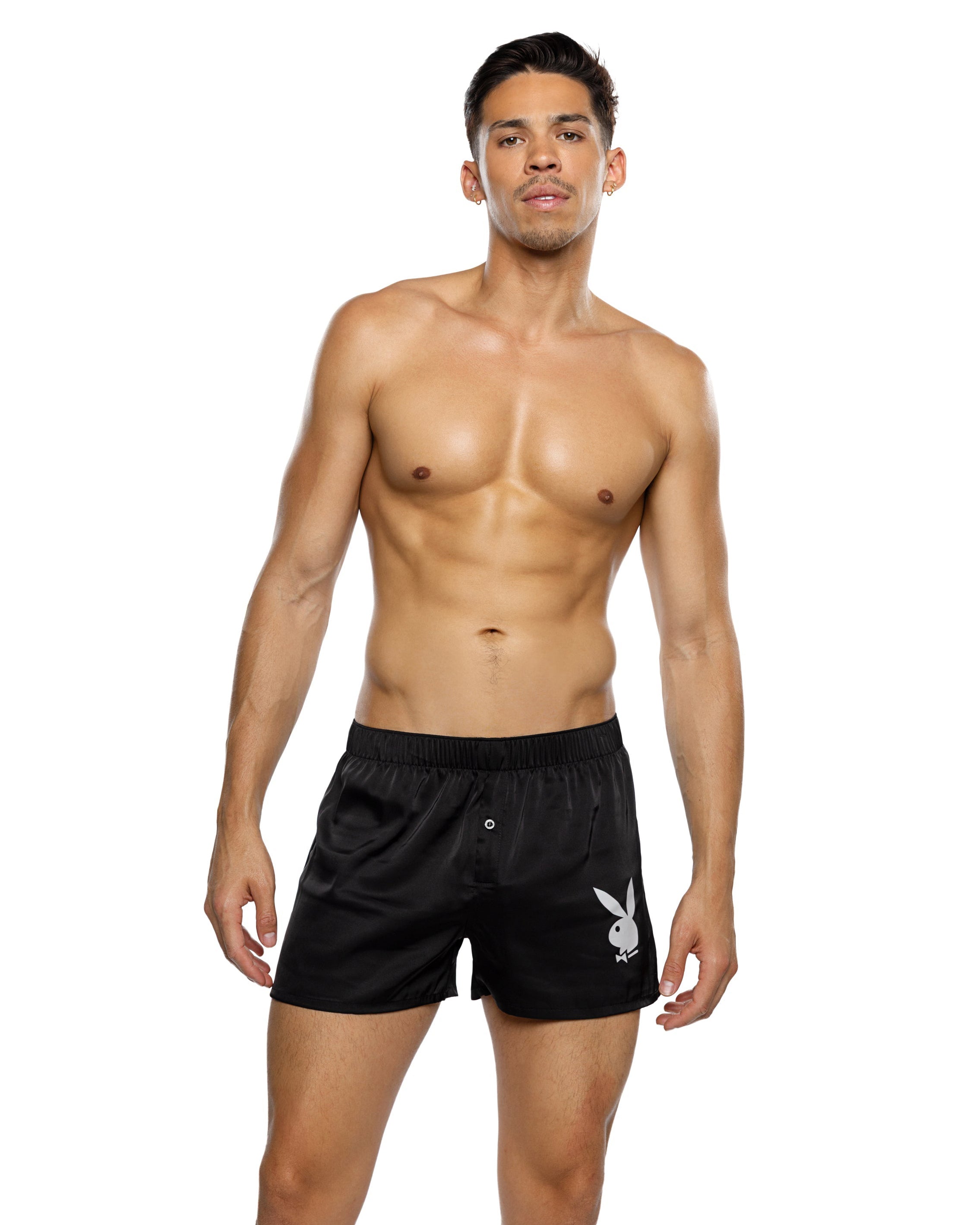 Upgrade your lingerie game with the Mens Playboy Bunny Boxer, designed for style, comfort, and a playful edge. Crafted from luxurious stretch satin, these boxers hug your body for a sleek, flattering fit that moves with you. The button fly adds a classic touch, while the side vents provide breathability and freedom of movement—perfect for lounging or turning heads at any event.