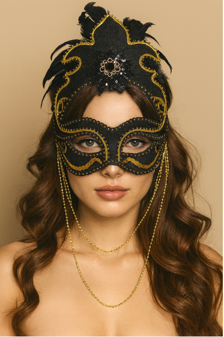 Sequin Mask with attached head piece, trimmed with gold brocade, feathers, and hanging beads. Ribbon tie back. Color: Black. Size: One Size. 100% Polyester