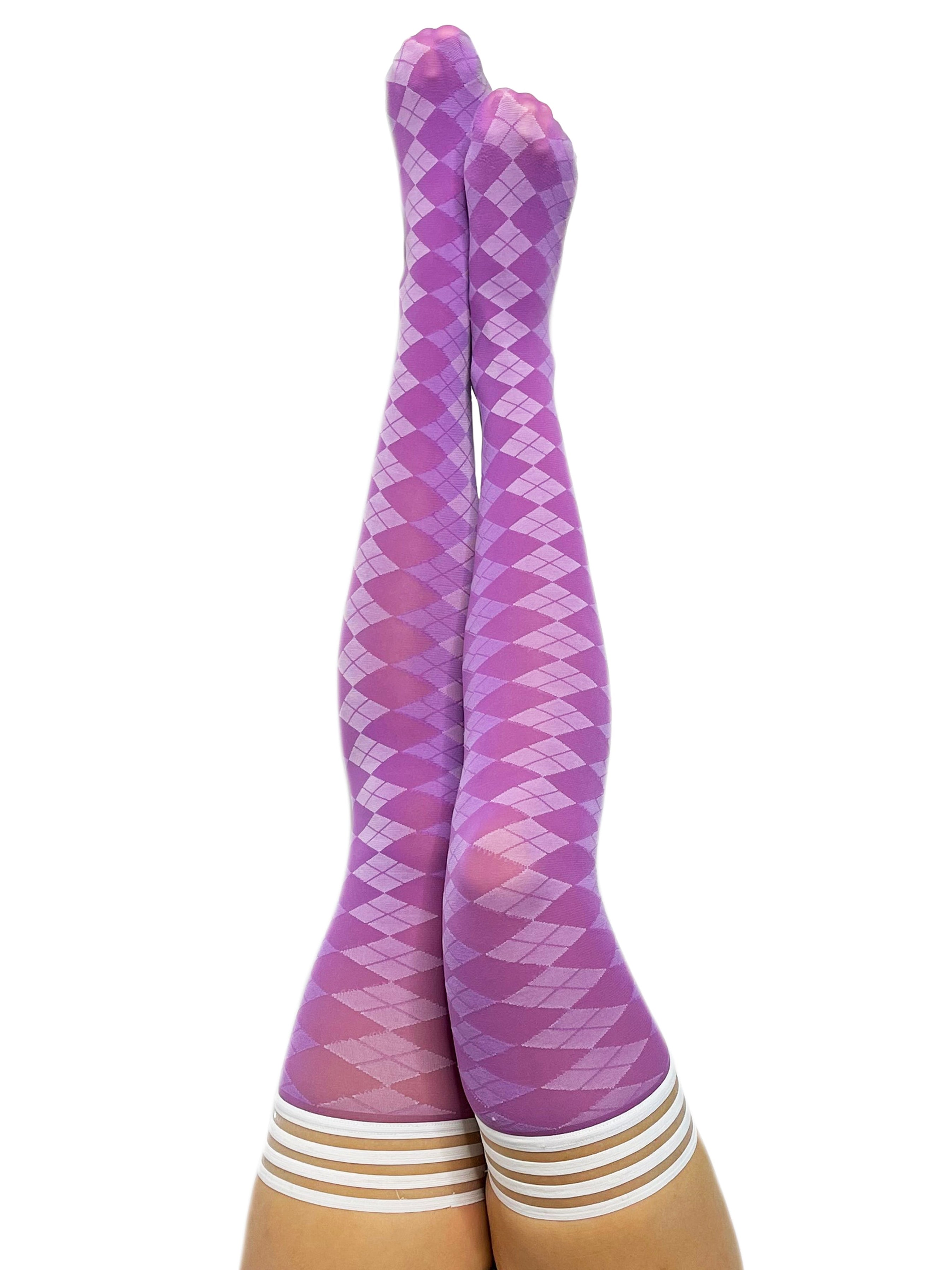 Kix'ies Golf Collection Purple Thigh-High Stockings. Add a little bit of extra flair to your golf outfits with the help of our opaque argyle print, thigh-high stockings! Kix'ies thigh-highs are designed for all-day wear, with a no-slip-grip. We offer Petite to Plus Size Stockings and are the #1 thigh-highs that actually stay up!
