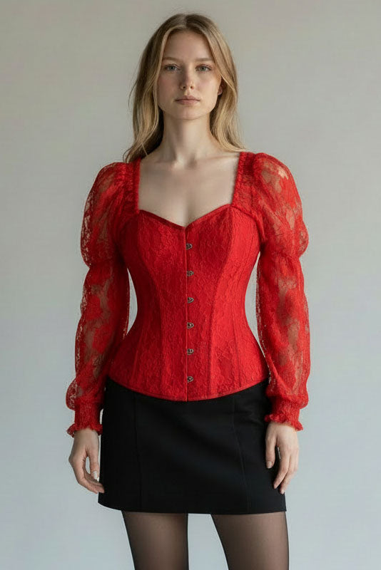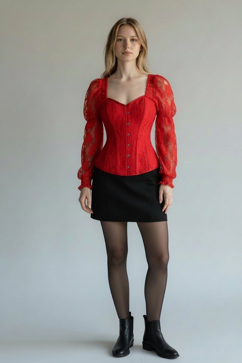 Top Drawer Red w/Red Lace Steel Boned Long Sleeve Corset