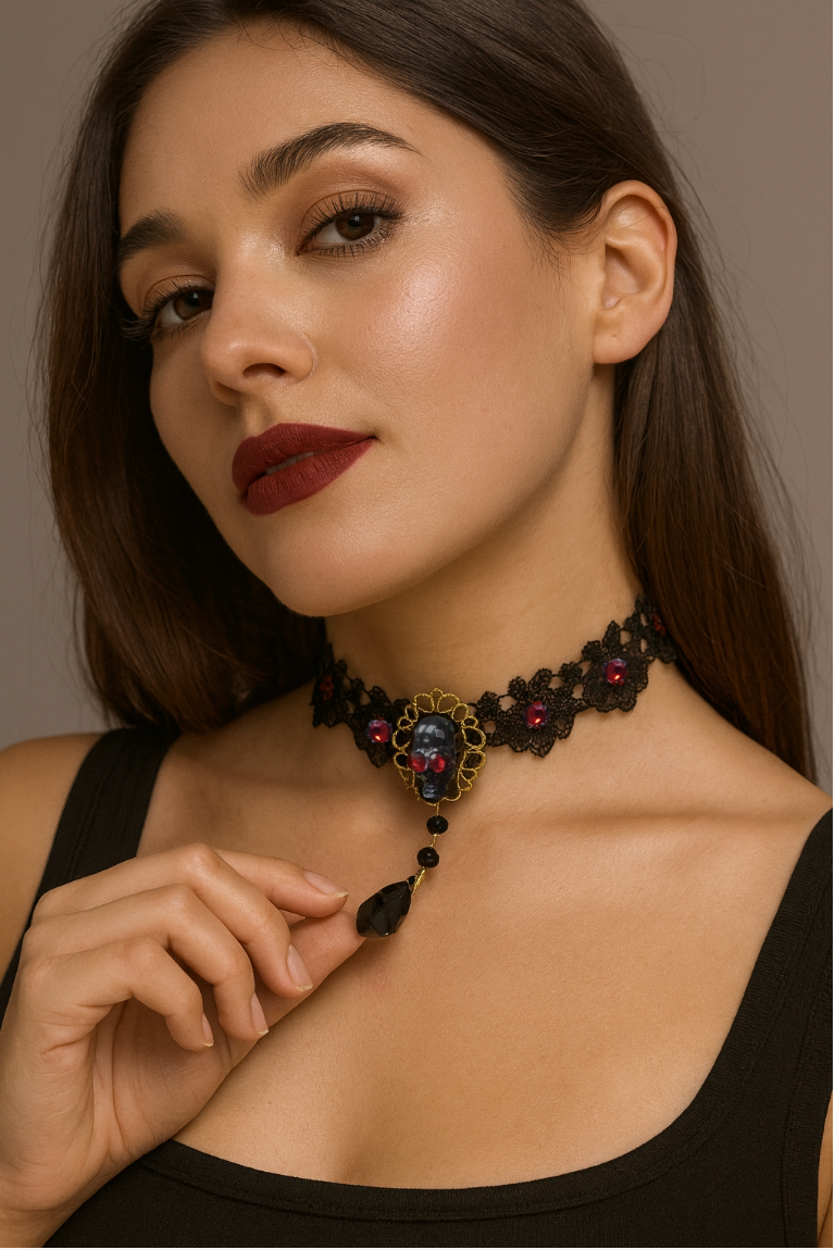 Lace Choker with faux gold skull pin and gems. Color: Black. One Size. 100%POLY